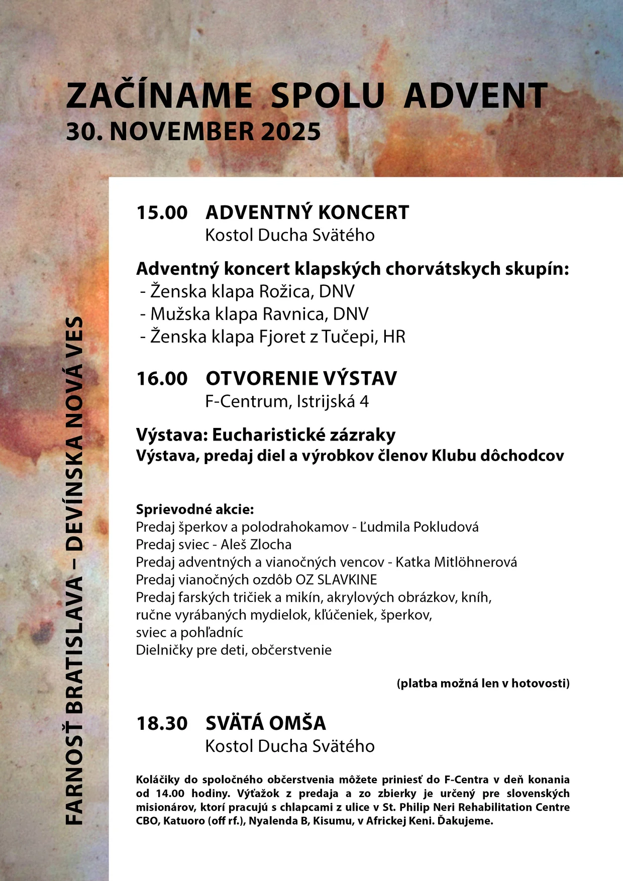 Začneme o 1500 hodine koncertom v kostole. O 1600 bude program pokračovať v priestoroch F-centra, otvorením umeleckej výstavy, môžete sa tešiť na tradičné dielničky pre deti, predaj kníh, šperkov, adventných vencov, sviečok.